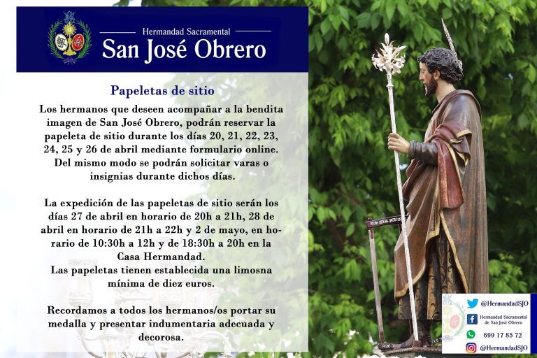 PAPELETAS DE SITIO PROCESIÓN SAN JOSÉ OBRERO Los hermanos que deseen acompañar a la bendita imagen de San José Obrero, …