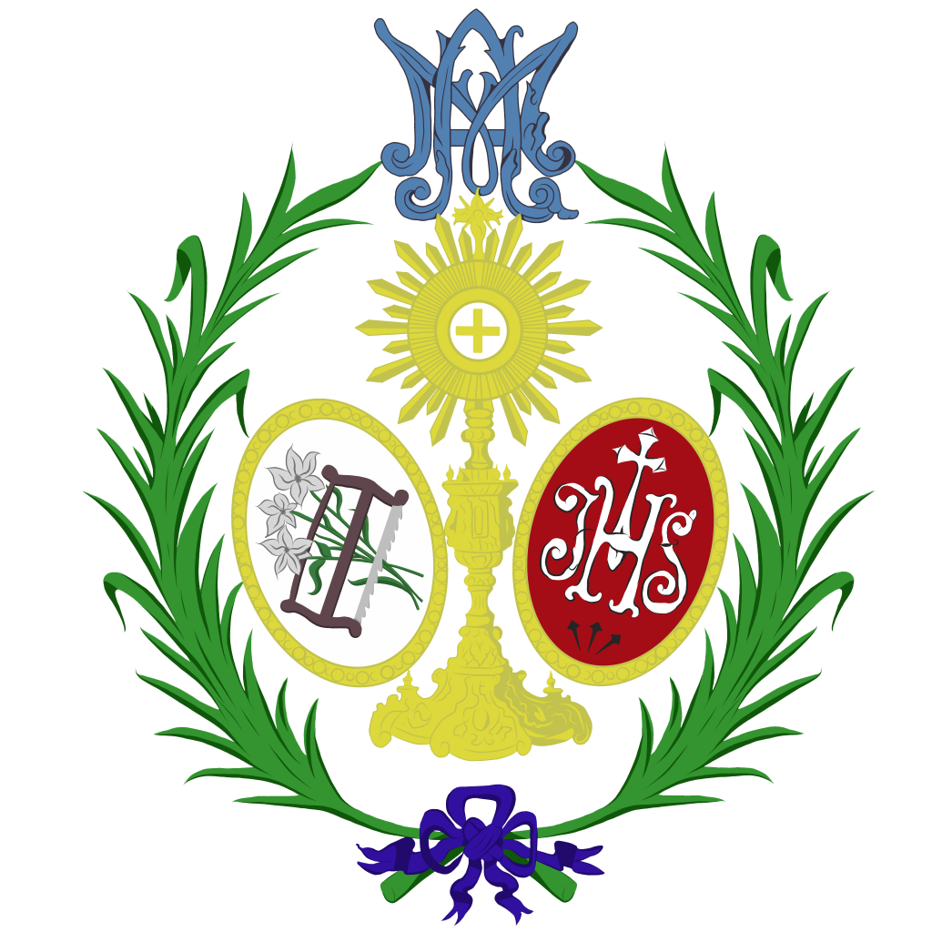 El escudo de la Hermandad se describe así: Custodia sacramental portando el Santísimo Sacramento, coronada por el anagrama del Ave María; a ambos lados de la custodia sendos escudetes ovales: el diestro ostenta la sierra y vara de azucenas, atributos de San José Obrero; el izquierdo ofrece el anagrama de Jesucristo Hombre Salvador, rematado con una Cruz, situándose bajo él los tres clavos de la crucifixión. Lateralmente y a cada uno de los lados encierra el conjunto sendas palmas que se cruzan en sus puntas inferiores.