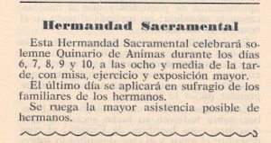 “Seria muy conforme con el concepto de Hermandad de Animas de nuestra Sacramental, el celebrar Quinario o Novena de sufragios, en el mes de noviembre, con Misa y Ejercicio propio.-“