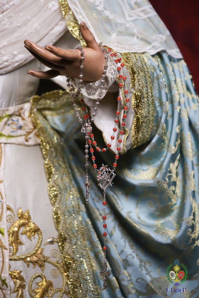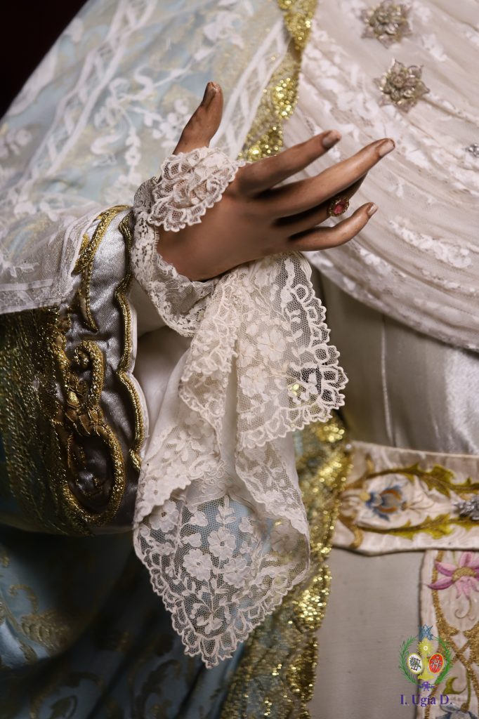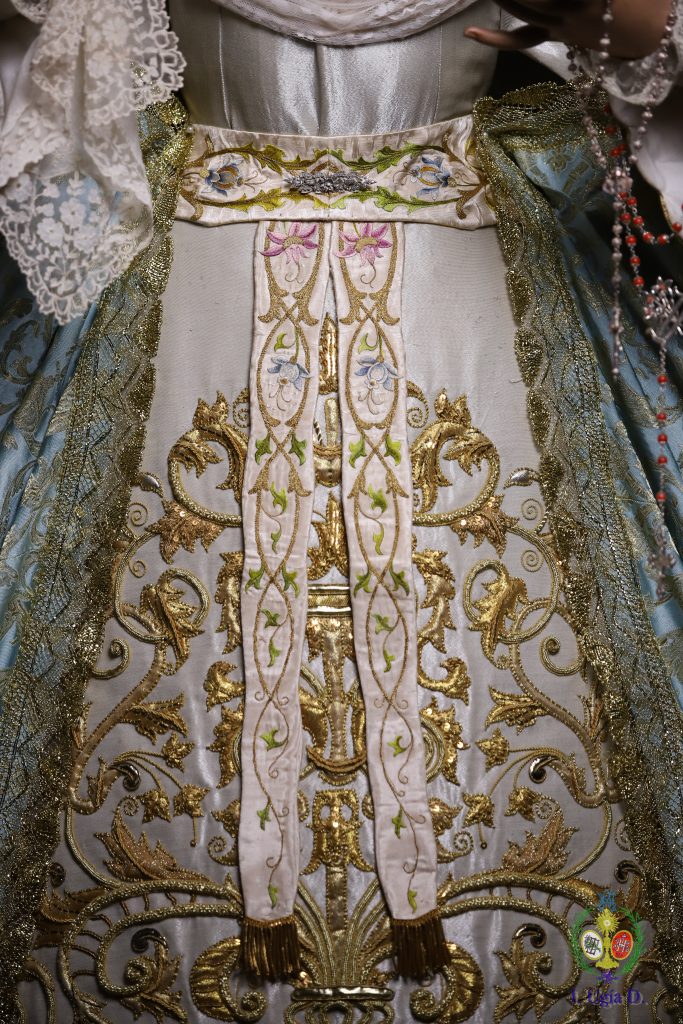 Porta la Santísima Virgen saya blanca de bordados de aplicación, fajín blanco con bordados florales procedentes de una estola del siglo XVIII, manto celeste y sobre sus sienes la corona de plata de los Hermanos Delgado.