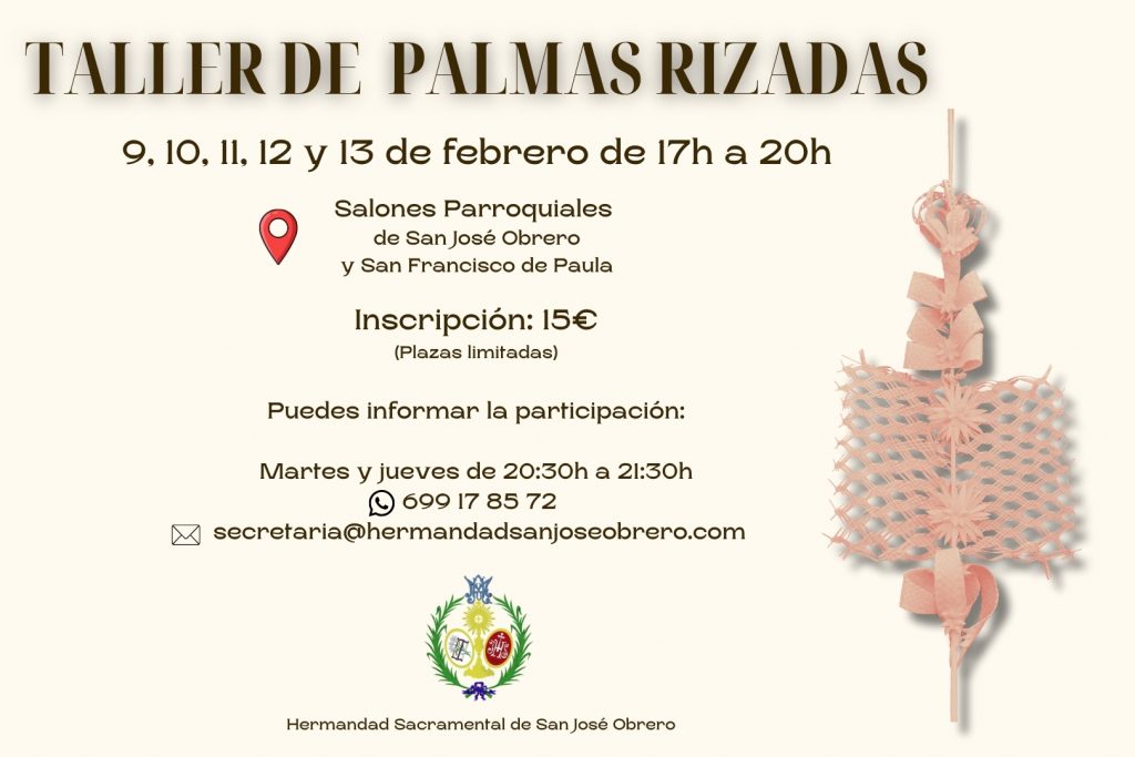 Los días 9, 10, 11, 12 y 13 de febrero en horario de 17h a 20h se realizará un taller de palmas en las dependencias parroquiales.