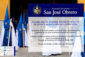ÚLTIMO DÍA DE EXPEDICIÓN DE PAPELETAS DE SITIO Y RESOLUCIÓN DE INCIDENCIAS Ante la alta demanda de hermanos que han solicitado retirar su papeleta de…