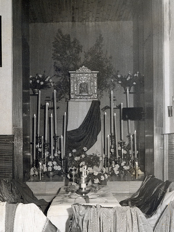 El Sagrario fue el primer enser adquirido por nuestra Hermandad, que entonces – años sesenta del s. XX – gozaba del carácter sacramental exclusivamente. En su concepción original, las dimensiones del mismo eran más reducidas que las actuales, y gran parte de su acabado se presentaba en madera, con diversos elementos en plata.