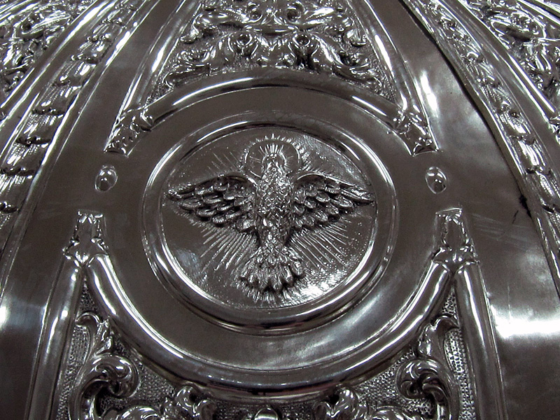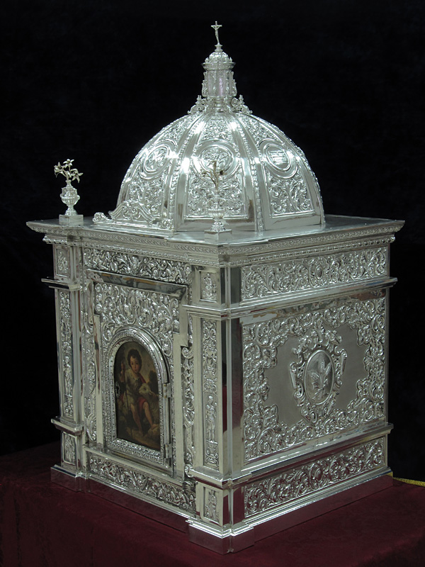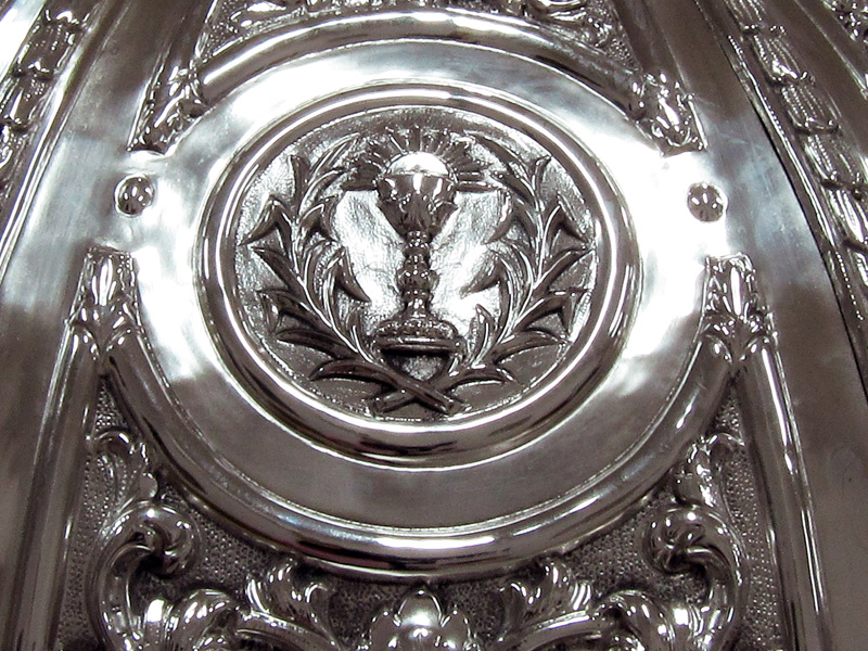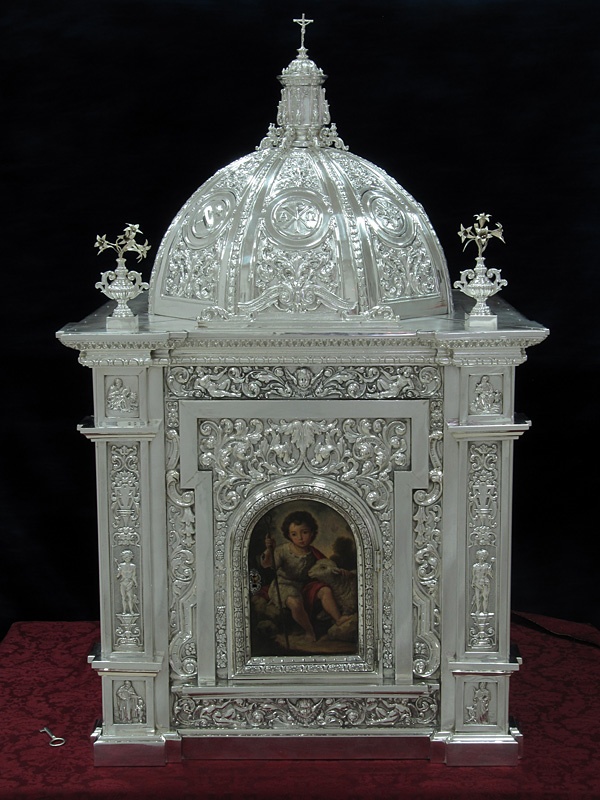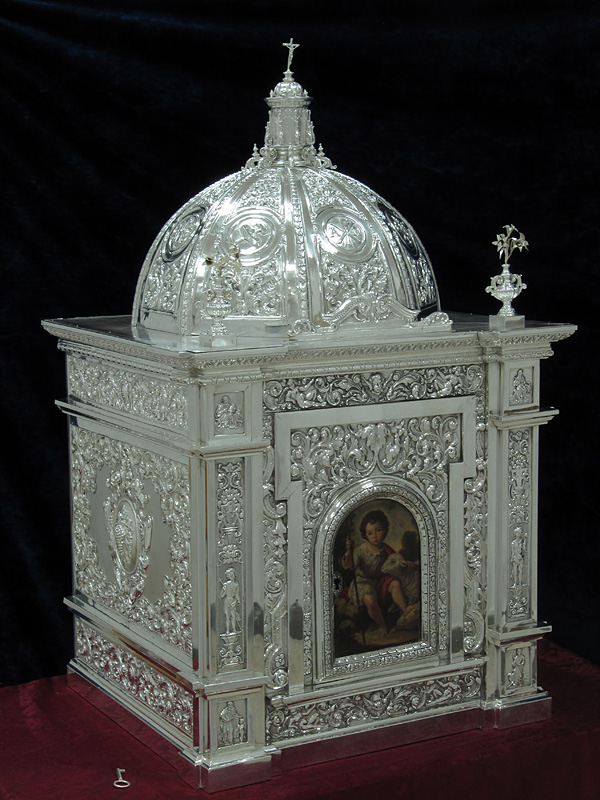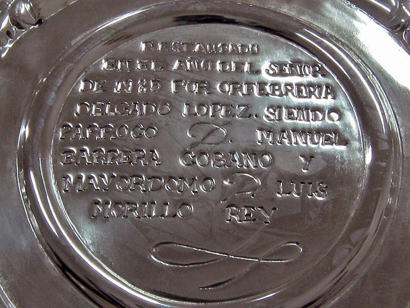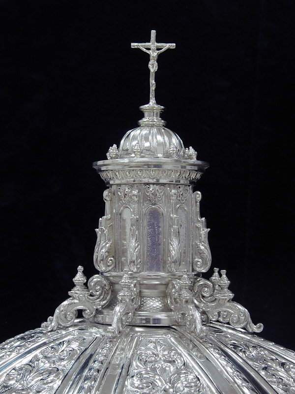 Sobre el mismo, se haya una cúpula semiesférica igualmente repujada, que presenta a su alrededor siete motivos alusivos al culto sacramental y a San José, siendo el octavo, en su parte trasera, una inscripción que aparece grabada y que dice: “RESTAURADO EN EL AÑO DEL SEÑOR DE 1985 POR ORFEBRERIA DELGADO LOPEZ. SIENDO PARROCO D. MANUEL BARRERA COBANO Y MAYORDOMO D. LUIS MORILLO REY”.