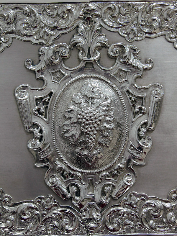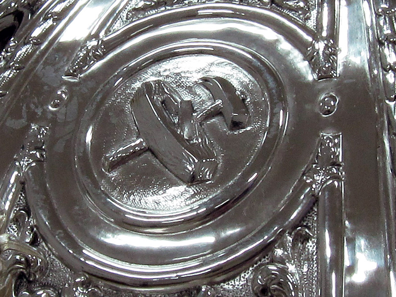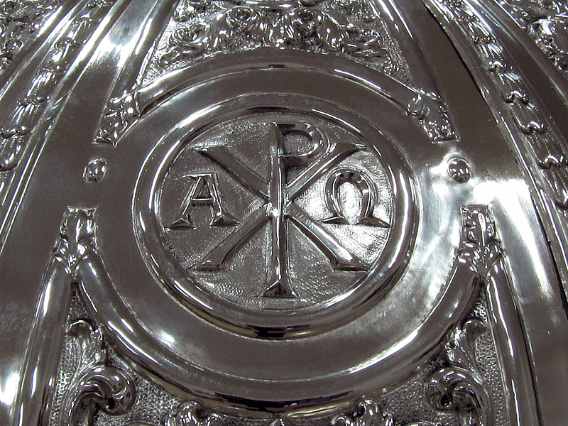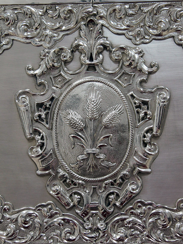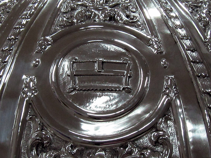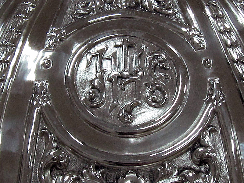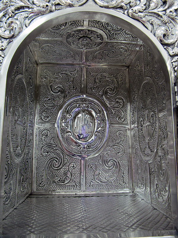 Sobre el mismo, se haya una cúpula semiesférica igualmente repujada, que presenta a su alrededor siete motivos alusivos al culto sacramental y a San José, siendo el octavo, en su parte trasera, una inscripción que aparece grabada y que dice: “RESTAURADO EN EL AÑO DEL SEÑOR DE 1985 POR ORFEBRERIA DELGADO LOPEZ. SIENDO PARROCO D. MANUEL BARRERA COBANO Y MAYORDOMO D. LUIS MORILLO REY”.