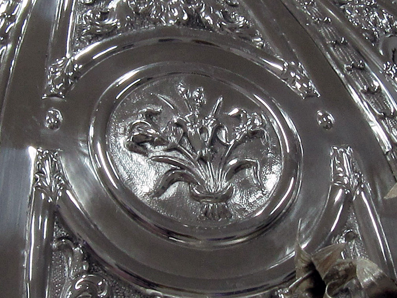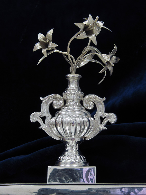 En el año 1985, nuestra Hermandad encargaba, al mismo taller de los Hermanos Delgado, una profunda remodelación que otorgó a la pieza la bella disposición que mantiene hoy día. Fue ejecutada totalmente de orfebrería, manteniendo los elementos en plata ya existentes y completando el conjunto con metal plateado repujado. Este trabajo, culminado en el mes de octubre de aquel año, está considerado el primero realizado en la Historia de este taller, que por entonces se hallaba situado en El Fontanal.