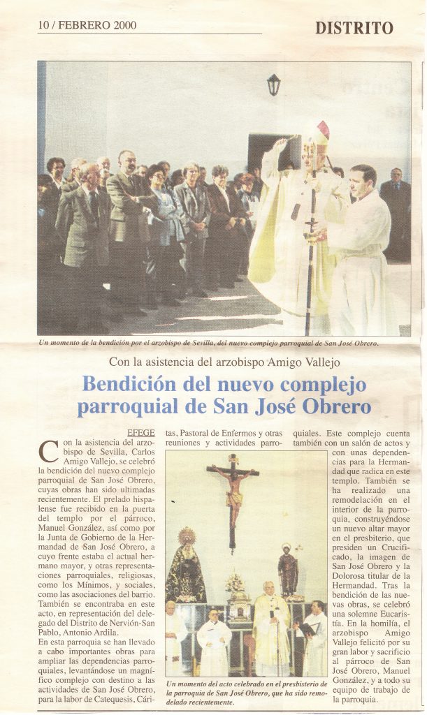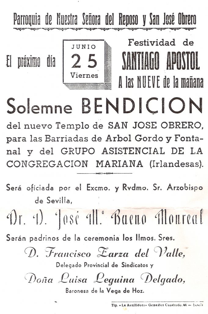 La Iglesia entera, que por naturaleza se debe a los hombres de su tiempo, a primeros del siglo pasado, en que surgieron graves conflictos en el mundo del trabajo, salió al paso de los creyentes y hombres de buena voluntad ofreciendo luz y apoyo con su doctrina social y presentando modelos de referencia, entre los que propuso especialmente a San José. En efecto, en 1955, el papa Pío XII, instauró para el primero de mayo la fiesta de San José Obrero. Poco después nuestra diócesis, en sintonía con las orientaciones del papa, propone abrir una parroquia en esta zona de la ciudad, donde son muchos los emigrantes que se van asentando, a los que por tanto había que proporcionarles un lugar de culto y un área de proyección pastoral.